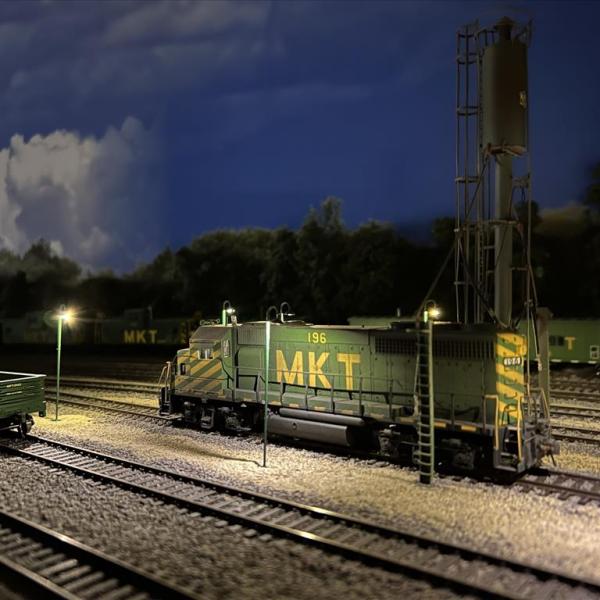 Missouri-Kansas-Texas (MKT) layout set in and around Waco, TX in the spring of 1987. Layout is a double deck with helix, fully signaled with ABS, and operates with JMRI. Layout is approximately 12x23 feet with a peninsula and 2 levels.